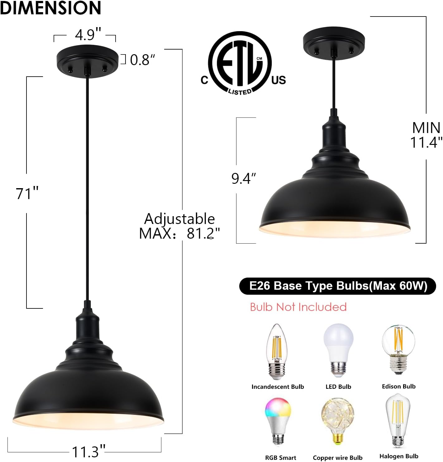 ✅ Adjustable Hanging Height: 71-inch cord allows for flexible installation up to 81.2 inches from ceiling