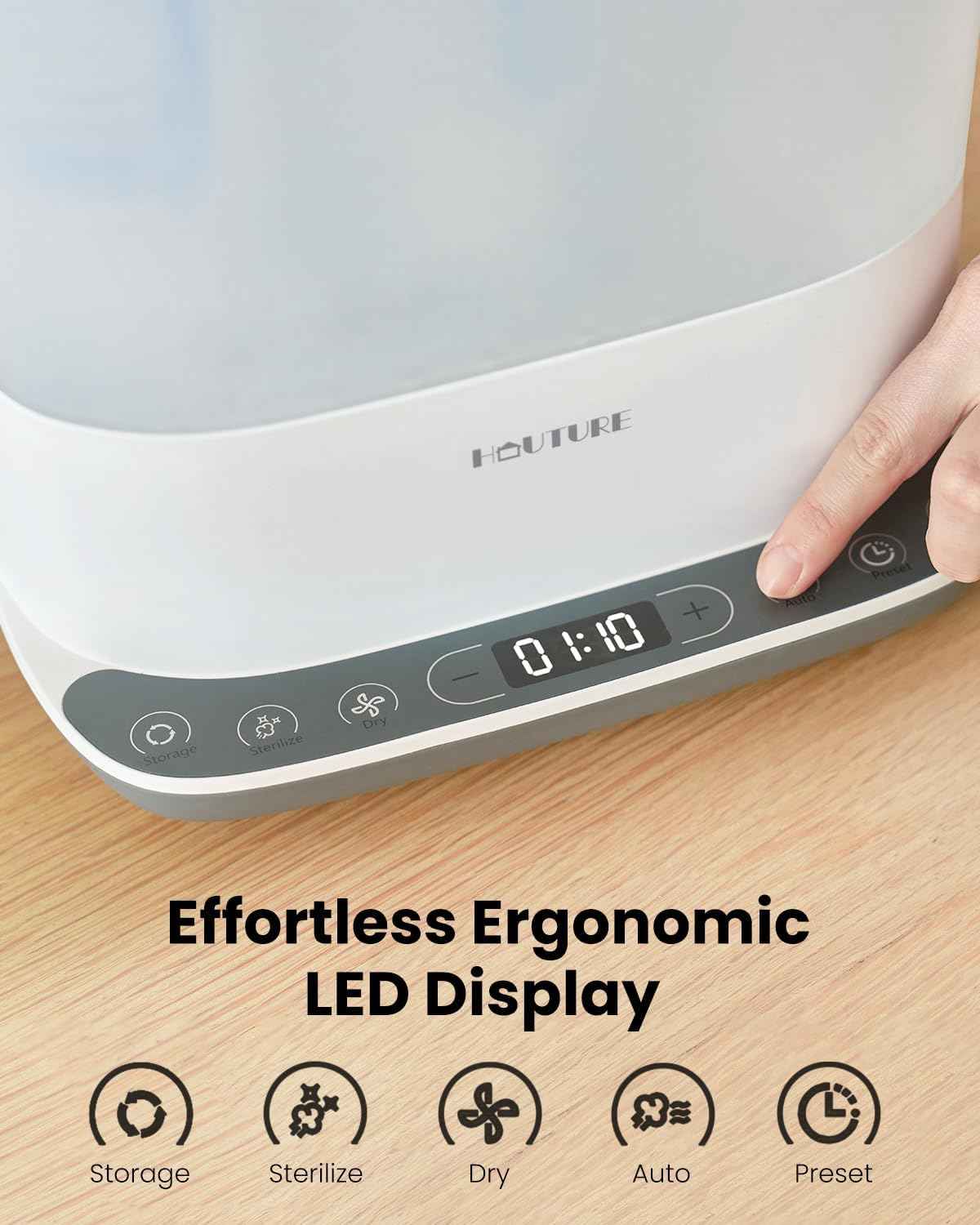 Ensure safe and hygienic feeding with the HAUTURE 6-in-1 Baby Bottle Sterilizer and Dryer. Designed for efficiency and safety, this electric steam sterilizer offers Auto, Dry, Store, Sterilize-only, and Preset modes to deliver superior hygiene without detergent residues.