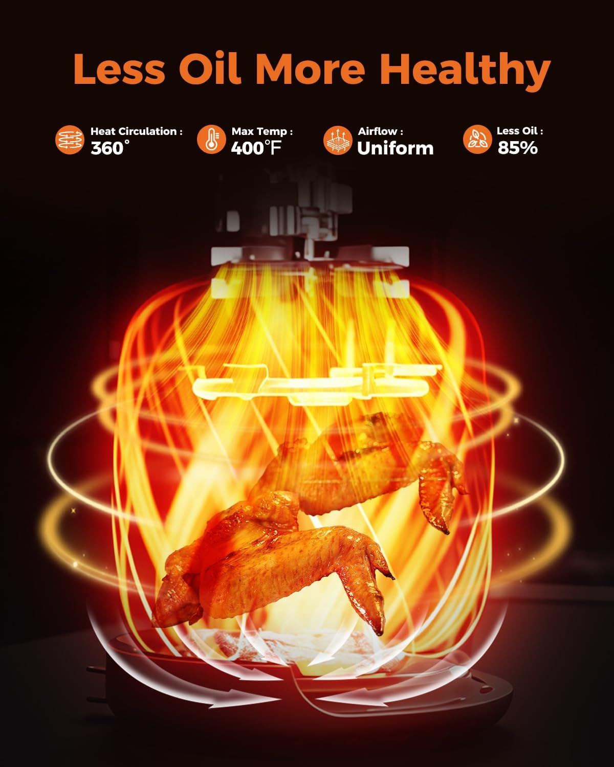 ✅ Less Oil, Healthier Cooking: Rapid 360° air circulation crisps food with 85% less oil, cooking up to 30% faster than traditional ovens.