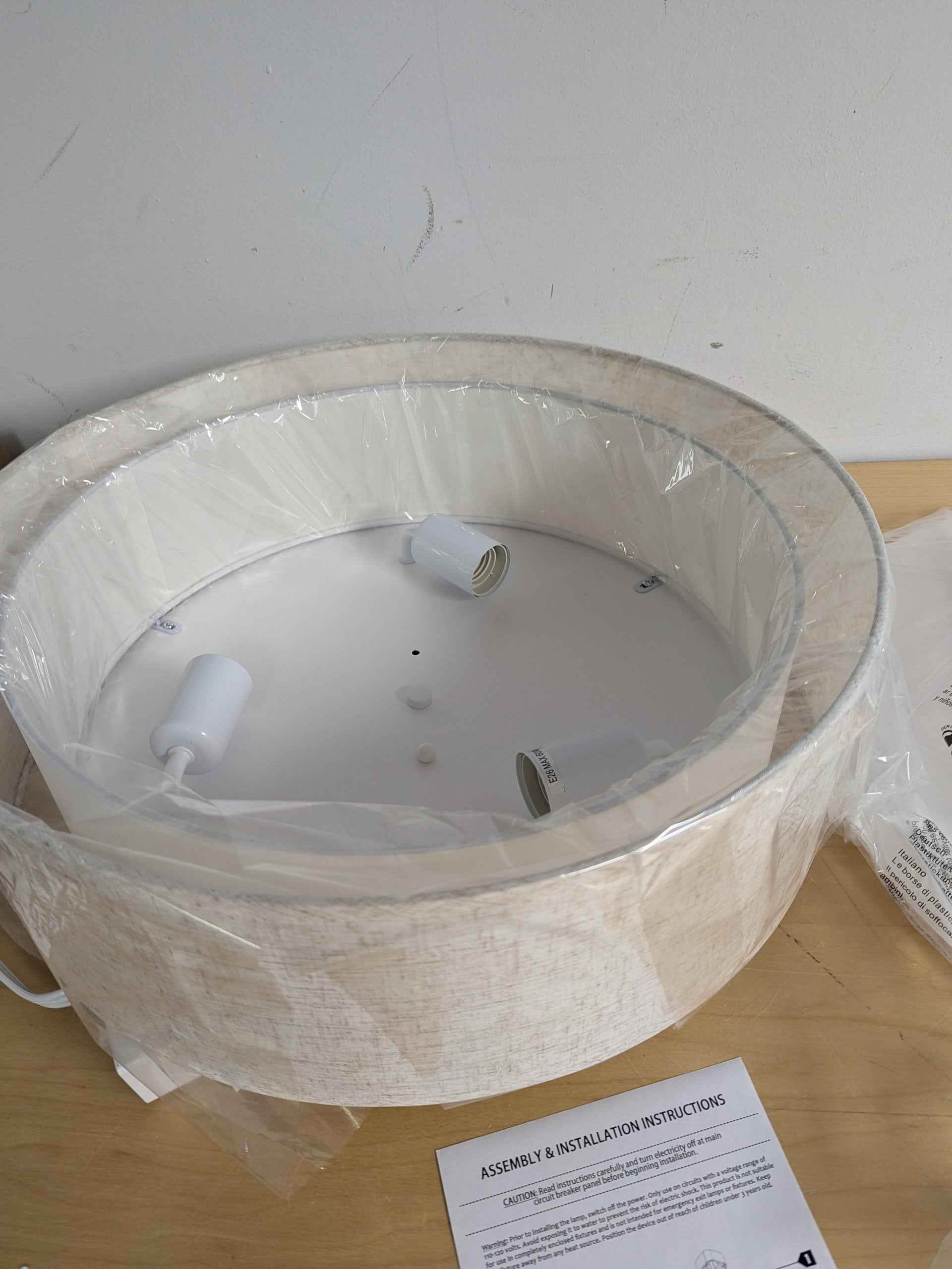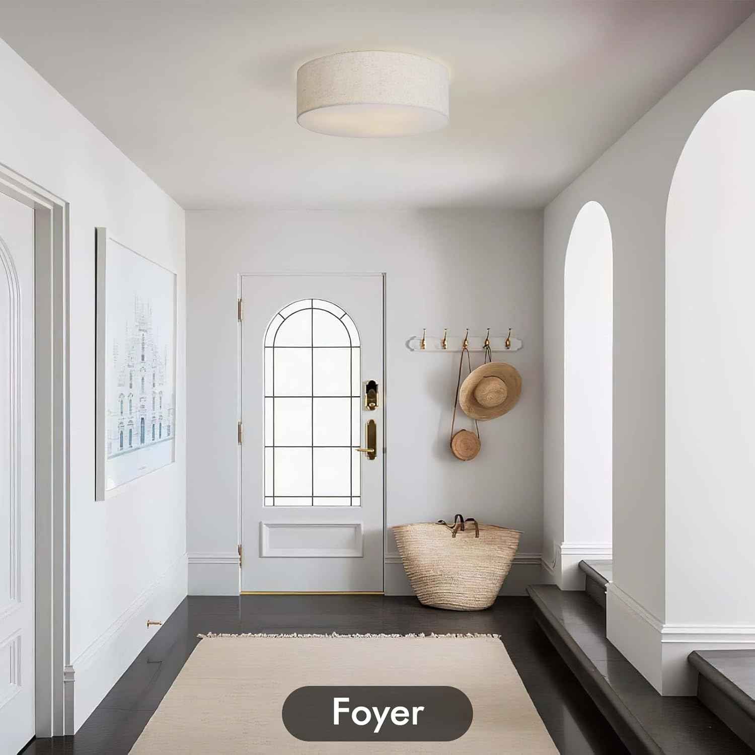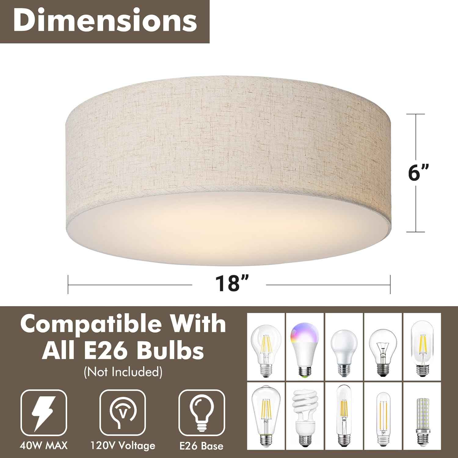 Modernize your space with the CALOKES 18-Inch Flush Mount Ceiling Light Fixture. This farmhouse-inspired drum-shaped light features a double-layered fabric shade—white gauze inner layer and linen outer layer—with an acrylic diffuser for soft, even illumination that’s gentle on the eyes.