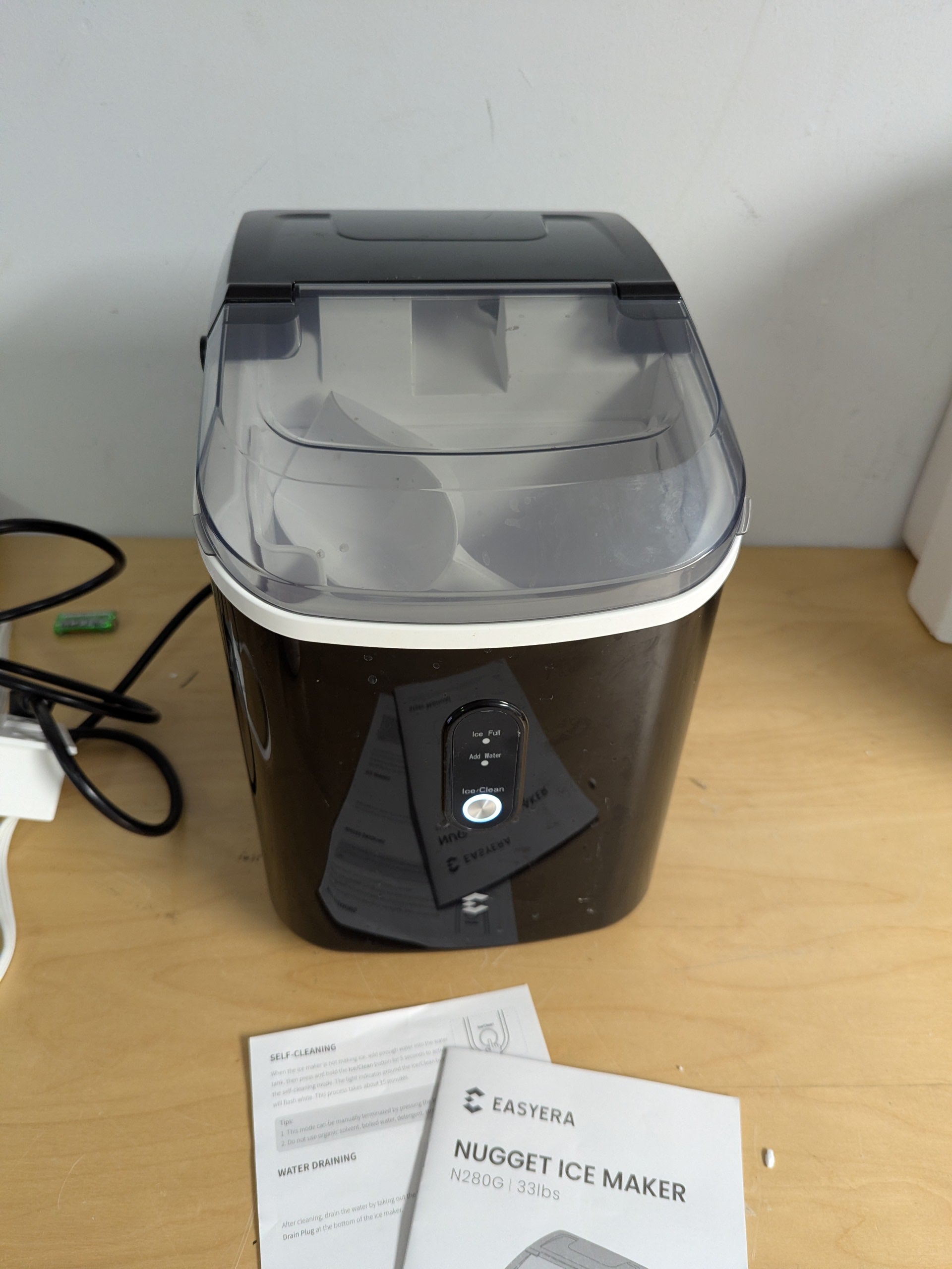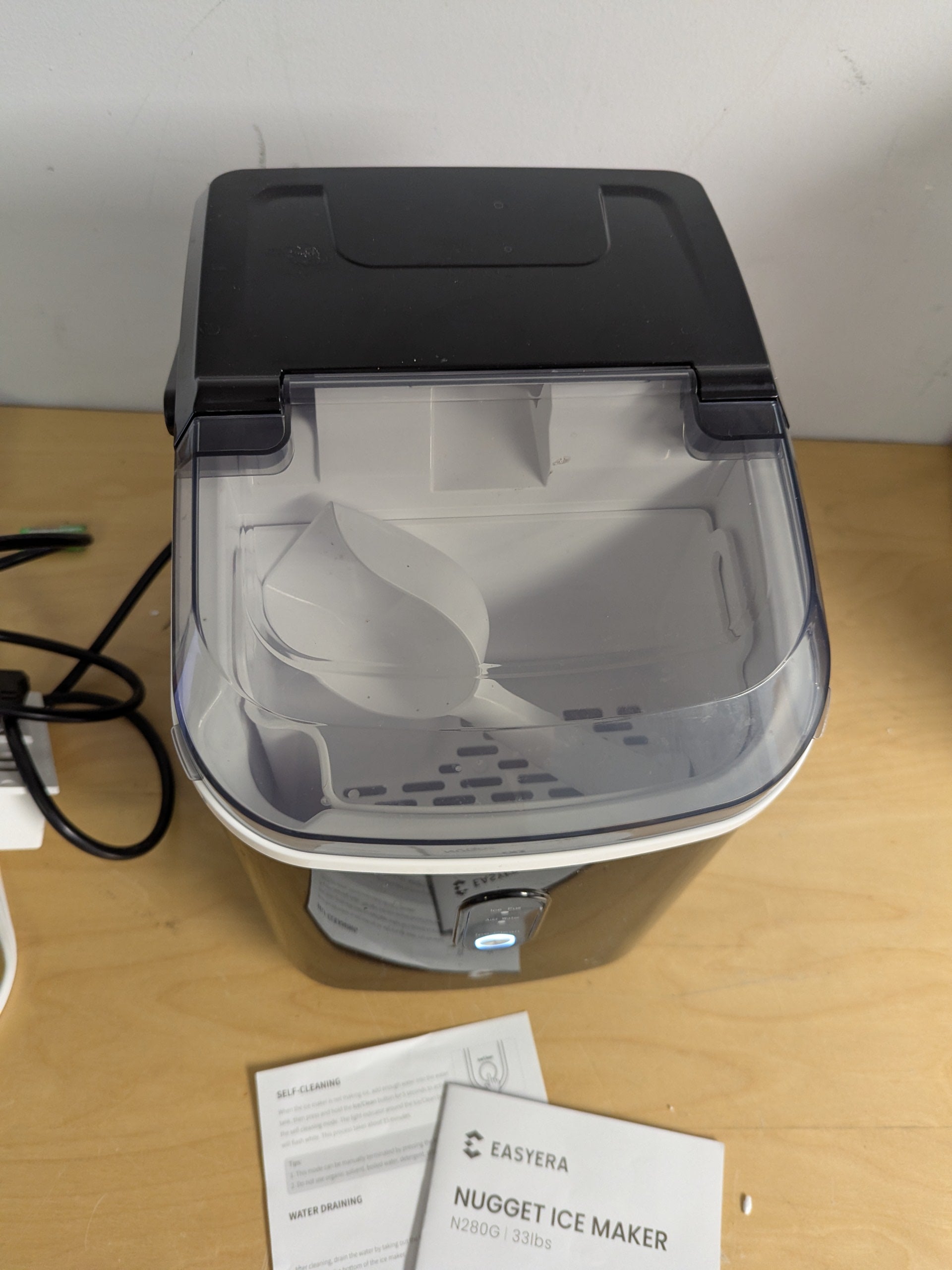 Delight in chewable ice with the EASYERA N280G Nugget Ice Maker. This countertop ice maker produces soft, crispy, and slow-melting chewable ice cubes, perfect for keeping drinks chilled without diluting flavors.