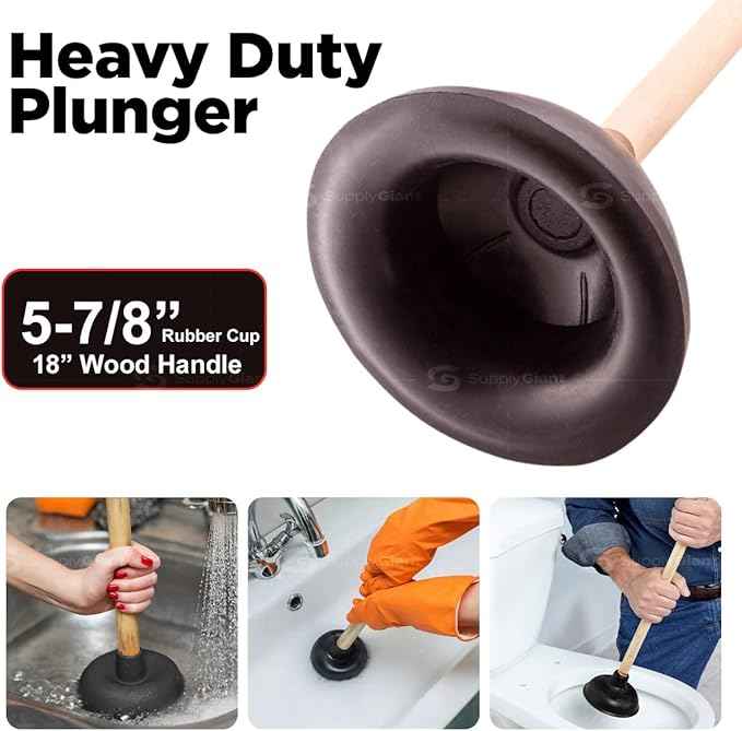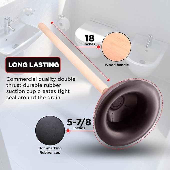 Handle stubborn blockages with the Heavy Duty Toilet Plunger Strong Suction Force Cup Rubber with 18 in. Wooden Handle. This tool brings commercial-grade performance to your home with a tight-sealing rubber cup and ergonomic wooden grip.