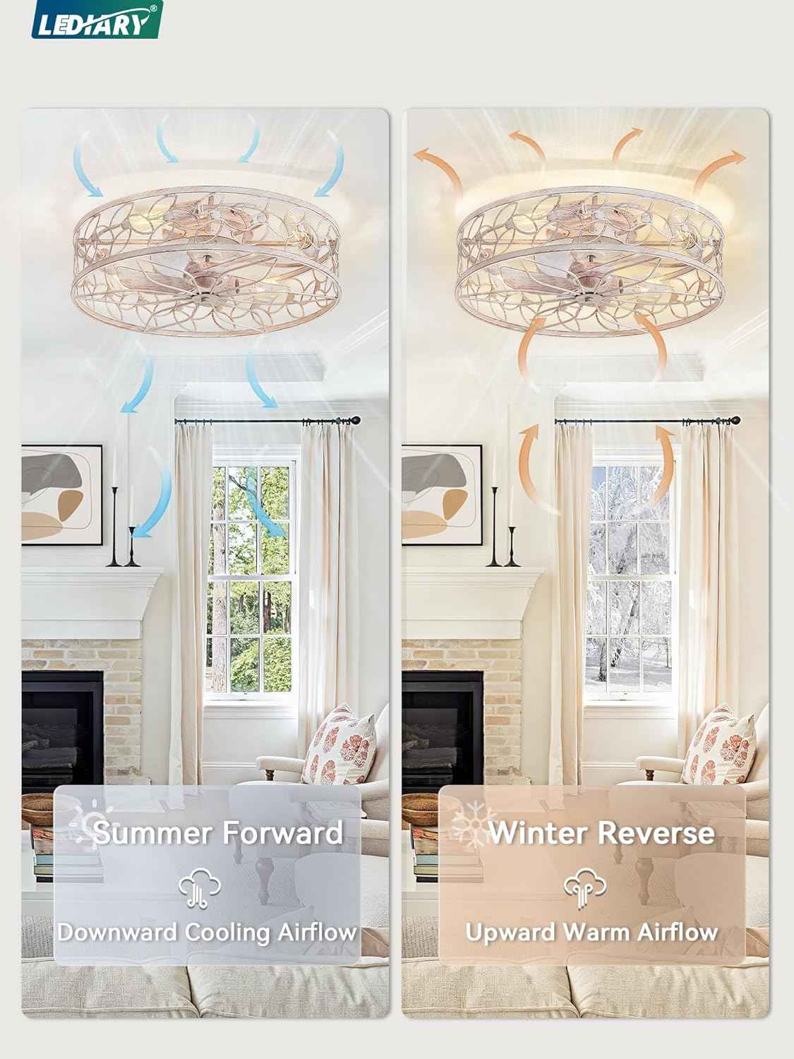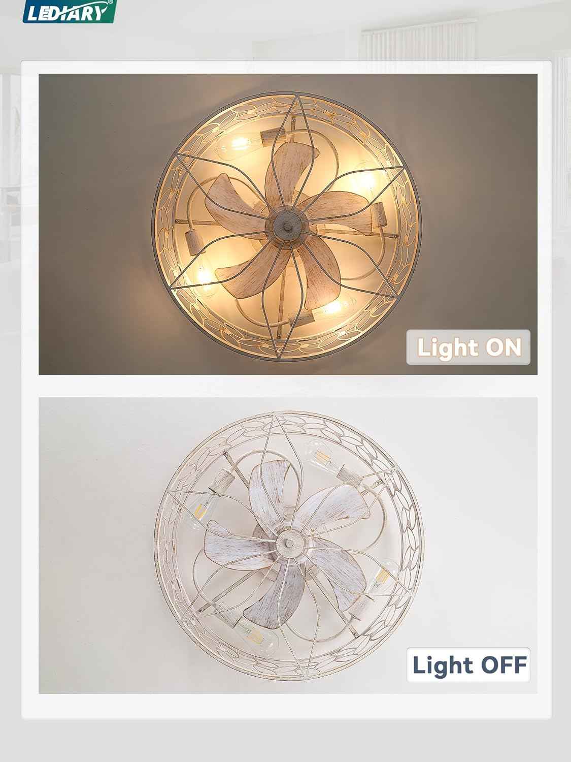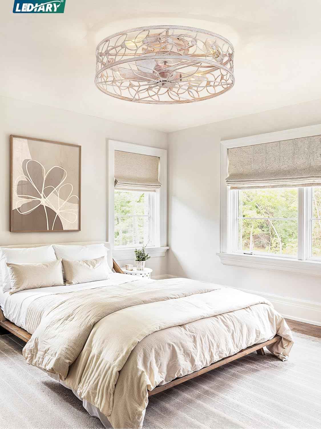 Achieve both style and comfort with the LEDIARY 23 Inch Caged Ceiling Fan with Lights, White‑Gold. This flush-mount, low-profile fan features a farmhouse-inspired caged design and quiet DC motor—ideal for cozy spaces with style.