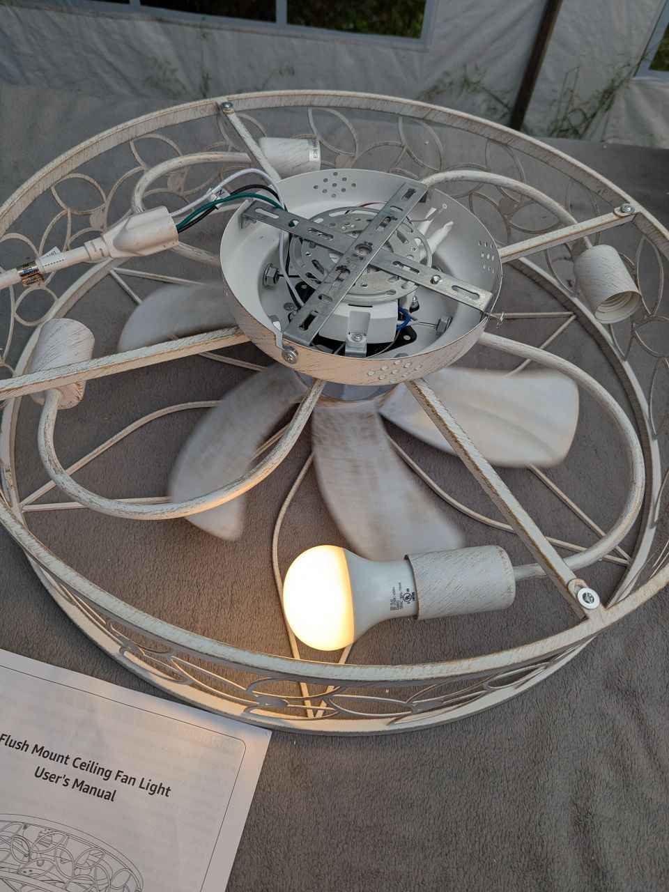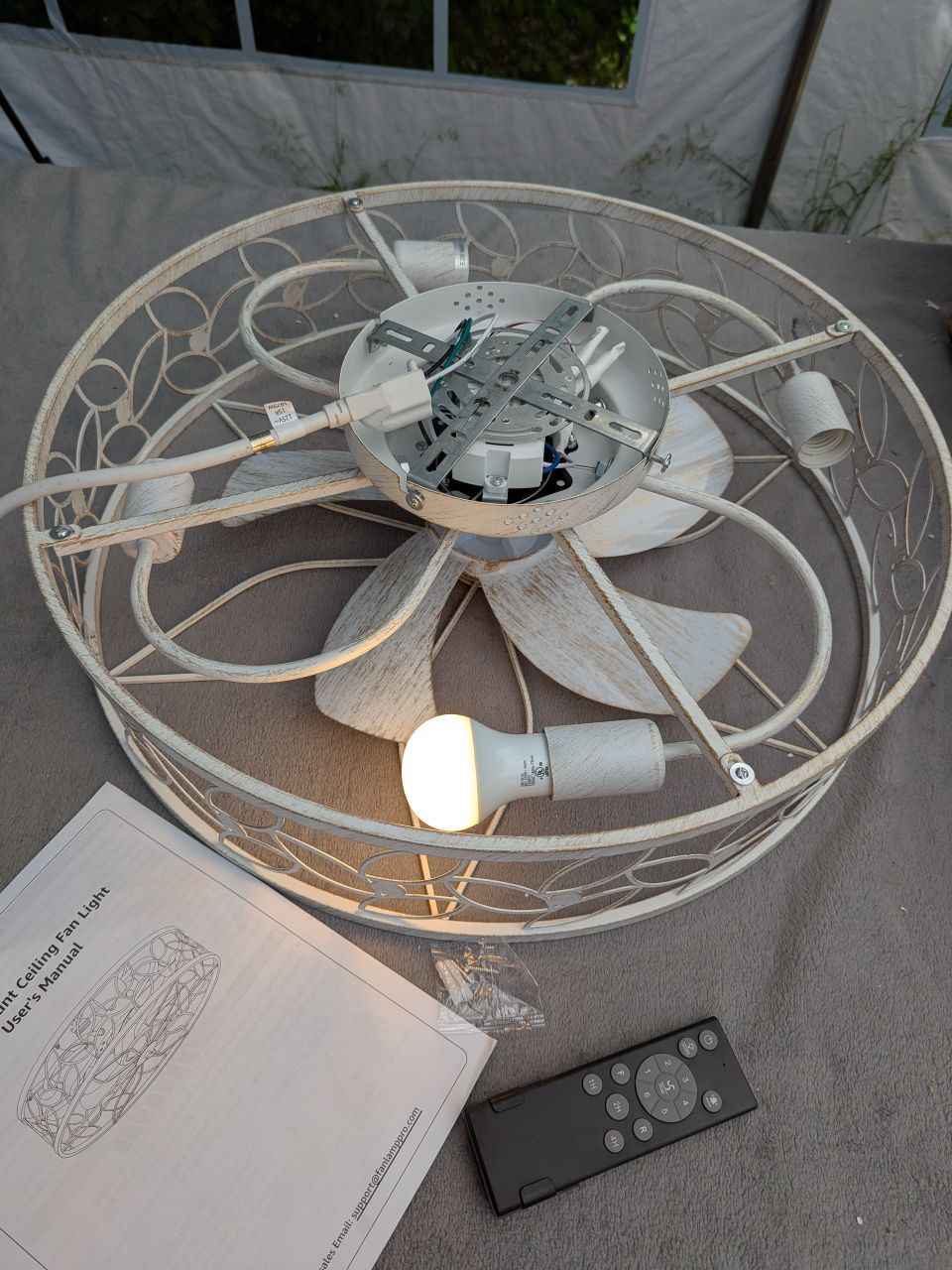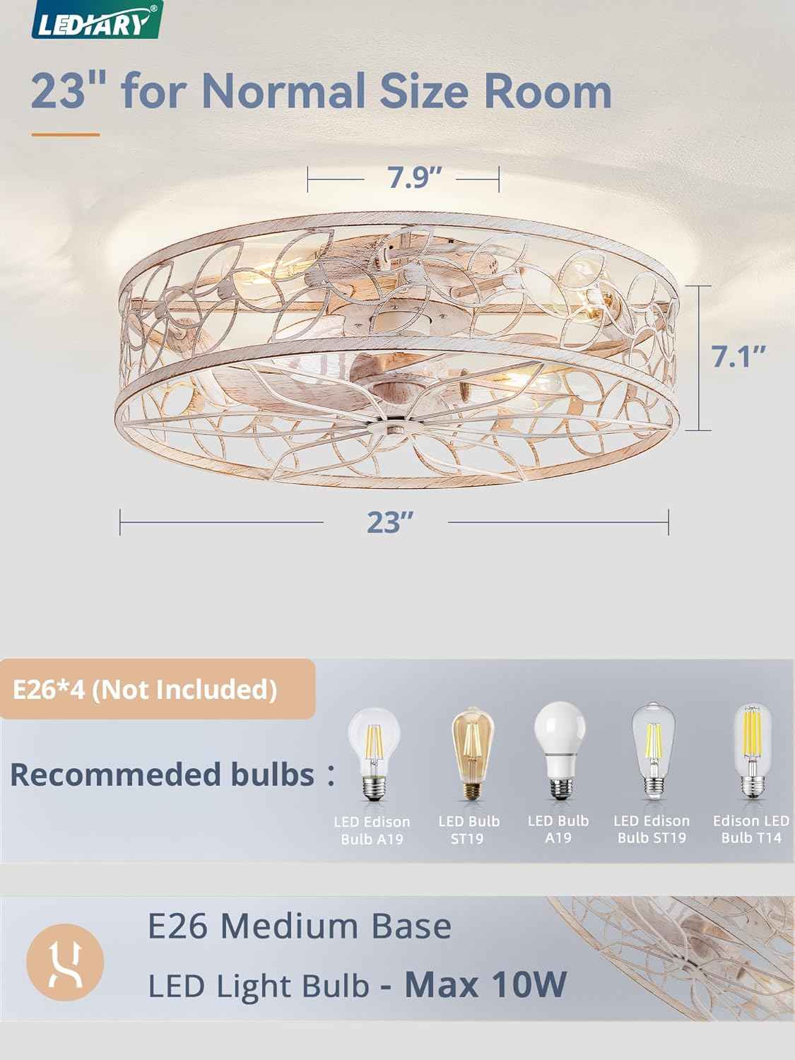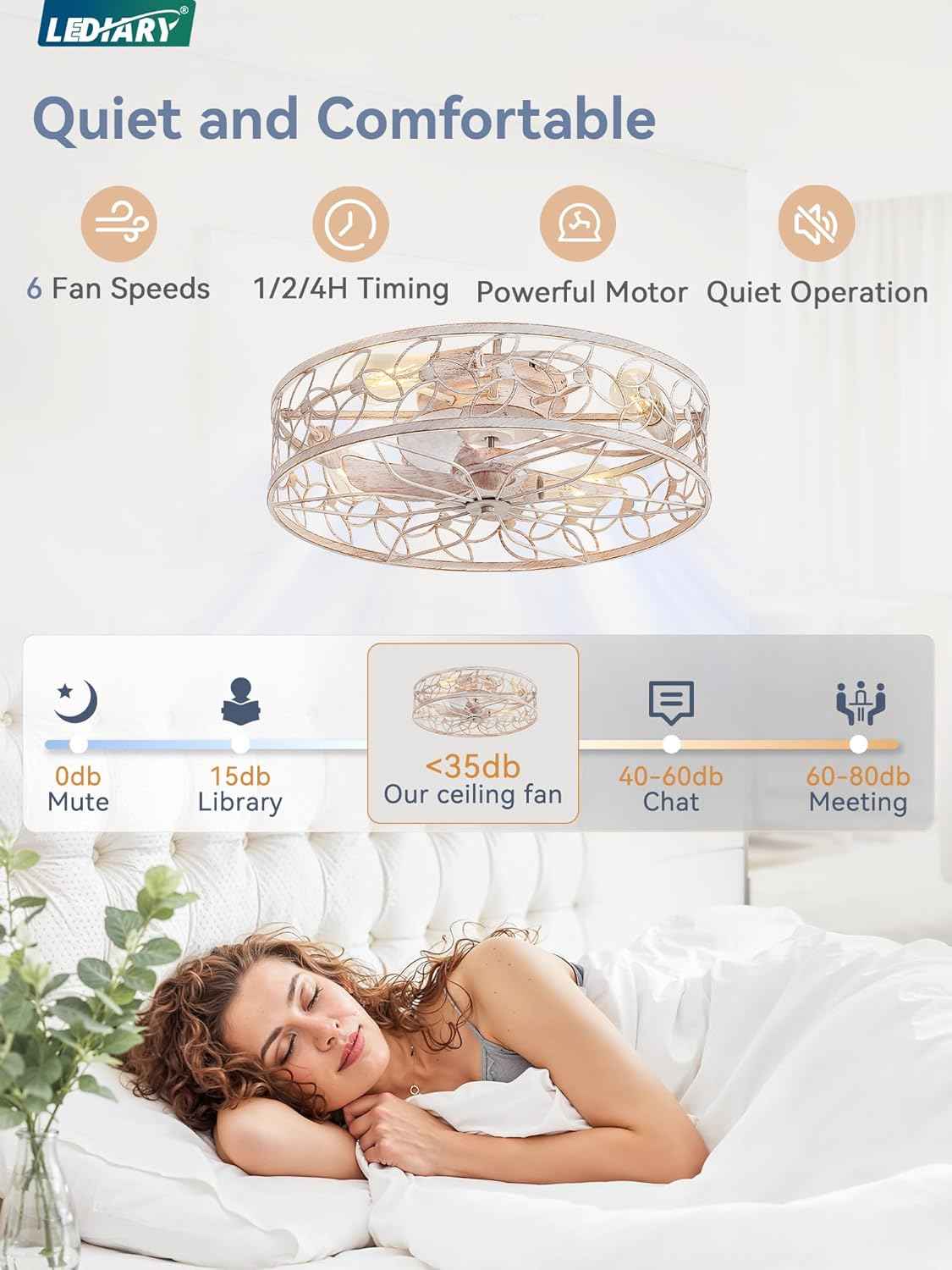 Achieve both style and comfort with the LEDIARY 23 Inch Caged Ceiling Fan with Lights, White‑Gold. This flush-mount, low-profile fan features a farmhouse-inspired caged design and quiet DC motor—ideal for cozy spaces with style.