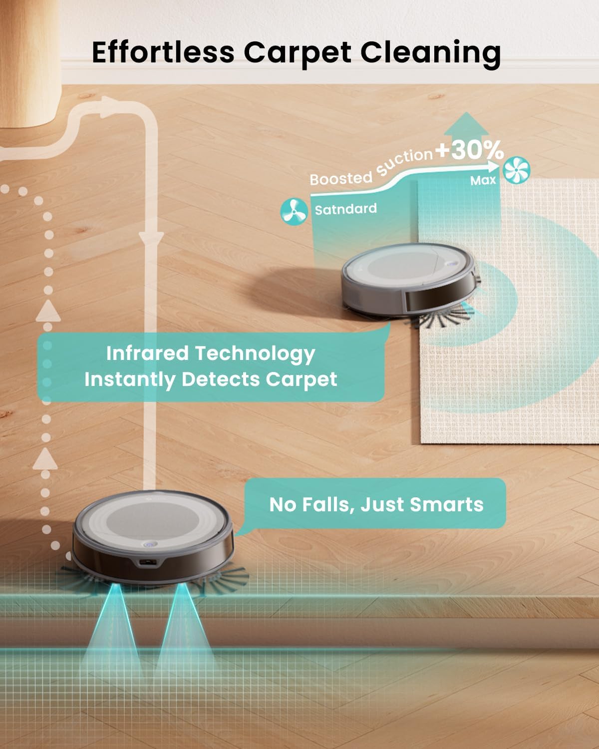 ✅ Carpet Detection & Auto-Boost: Automatically adjusts suction power for deep cleaning on carpets while avoiding water stains