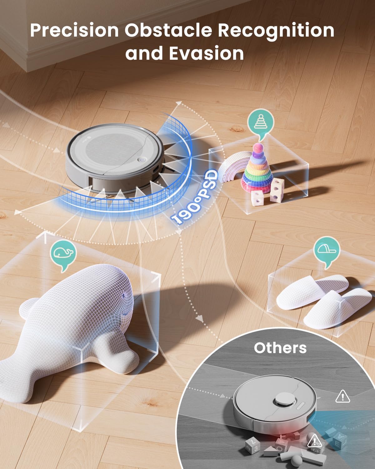 ✅ 190° PSD Obstacle Avoidance: Precisely detects furniture and small objects with millimeter-level accuracy even in complete darkness
