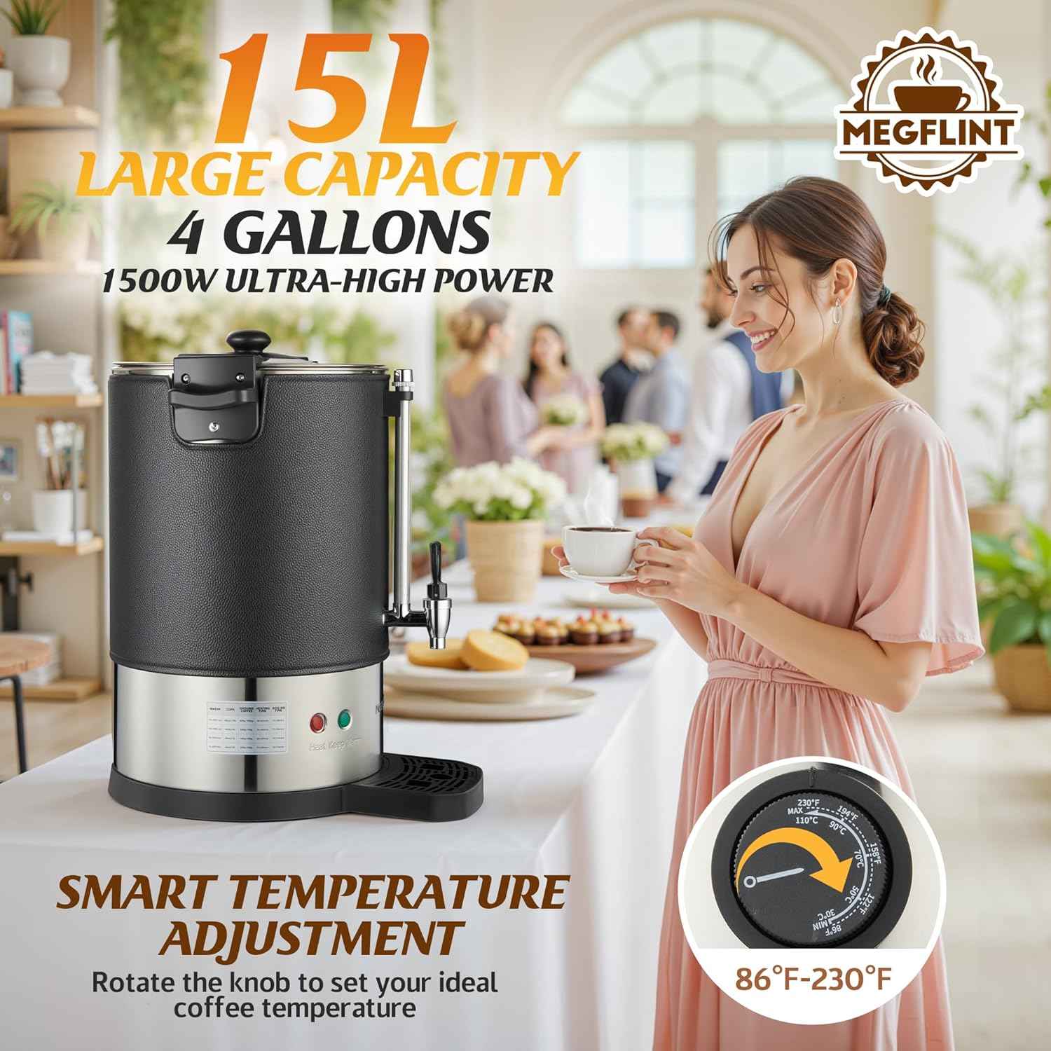 ✅ 100 Cup Capacity: Brew up to 15 liters (4 gallons) of coffee in just 40 minutes, with one cup ready every 30 seconds