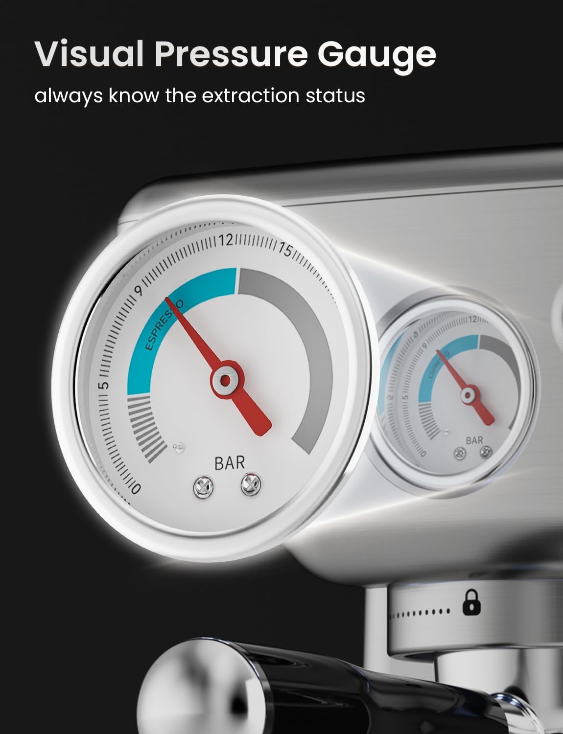 • Special Features: 15 Bar high pressure extraction, 198°F precise water temperature, pre-infusion function, visible pressure gauge