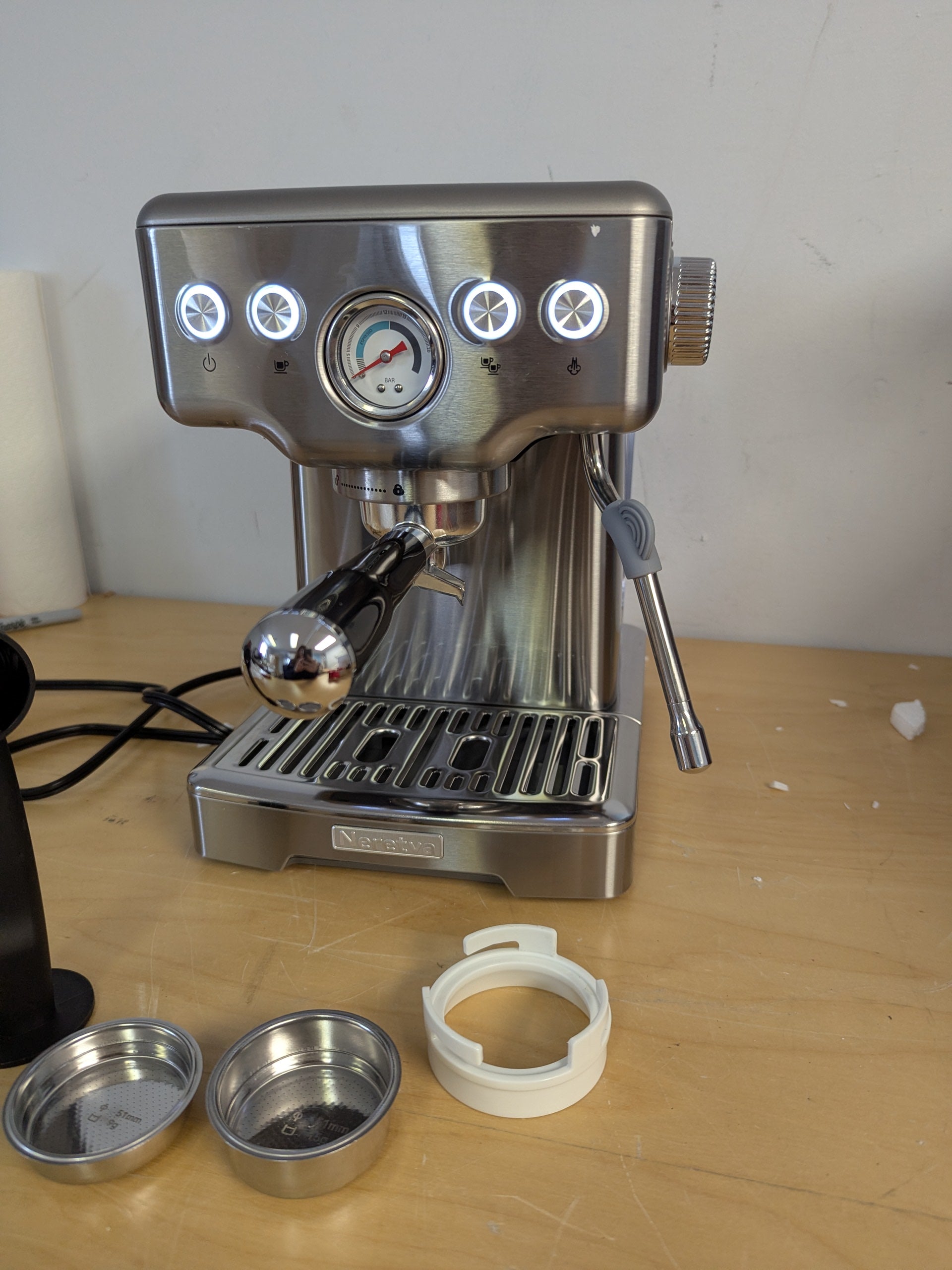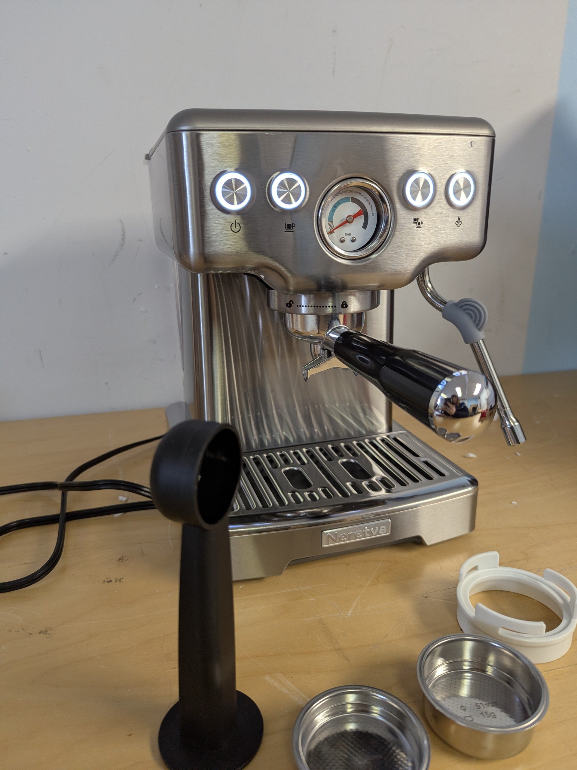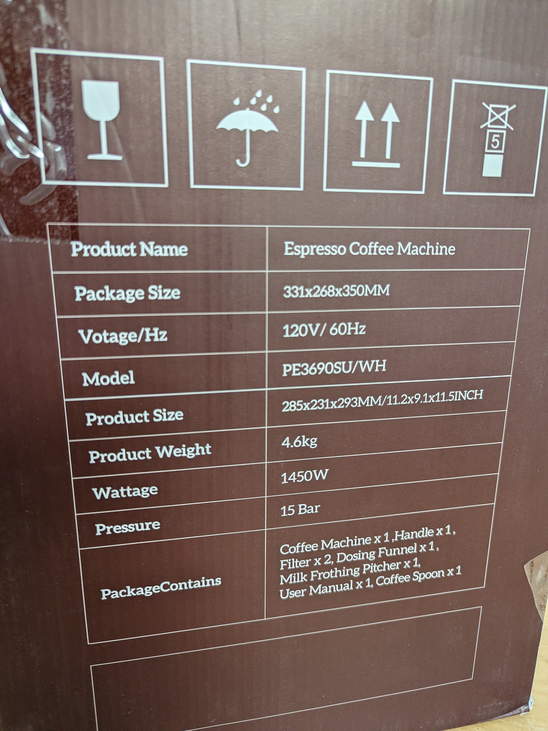 • Includes: Espresso machine, portafilter, 2 filters, coffee spoon, dosing funnel, milk frothing pitcher, user manual