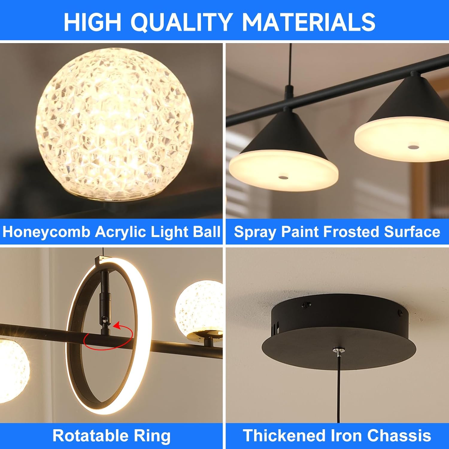 ✅ Factory Direct Supply + Cost-effective: Crafted with high-quality alloy aluminum and a durable spray paint finish, this chandelier is corrosion-resistant and long-lasting. The 3 thickened acrylic honeycomb balls and 3 conical lampshades provide soft, diffused light that mimics natural daylight for a comfortable ambiance.