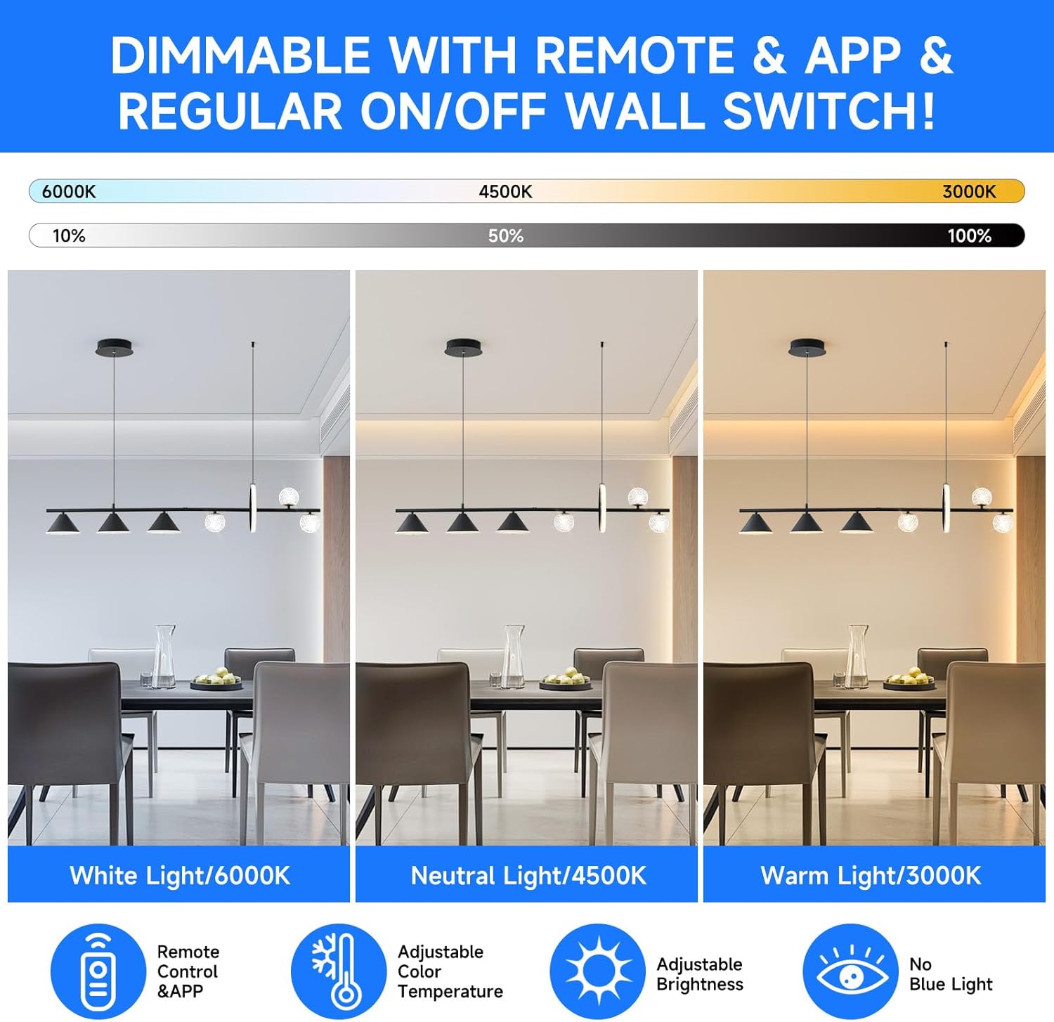 ✅ 3-Color Dimmable with Remote + High Performance: Adjust between warm, neutral, and bright white light using the remote control. With a color temperature range of 3000K–6000K and brightness adjustable from 10% to 100%, it offers versatile lighting for any mood or occasion. The LED chips ensure uniform illumination with no harsh glare, thanks to an eye protection system and CRI>80.