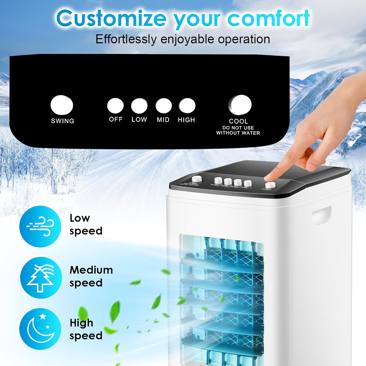 Stay cool all summer with the IKBAOME Freestanding Air Cooler. Designed for maximum comfort and efficiency, this portable air cooler features a 6L large-capacity water tank and comes with three ice packs to enhance cooling performance. The top-fill design makes refilling effortless, while the 3-speed settings and adjustable fan allow you to customize airflow direction up to 60 degrees left and right or up and down for personalized comfort.