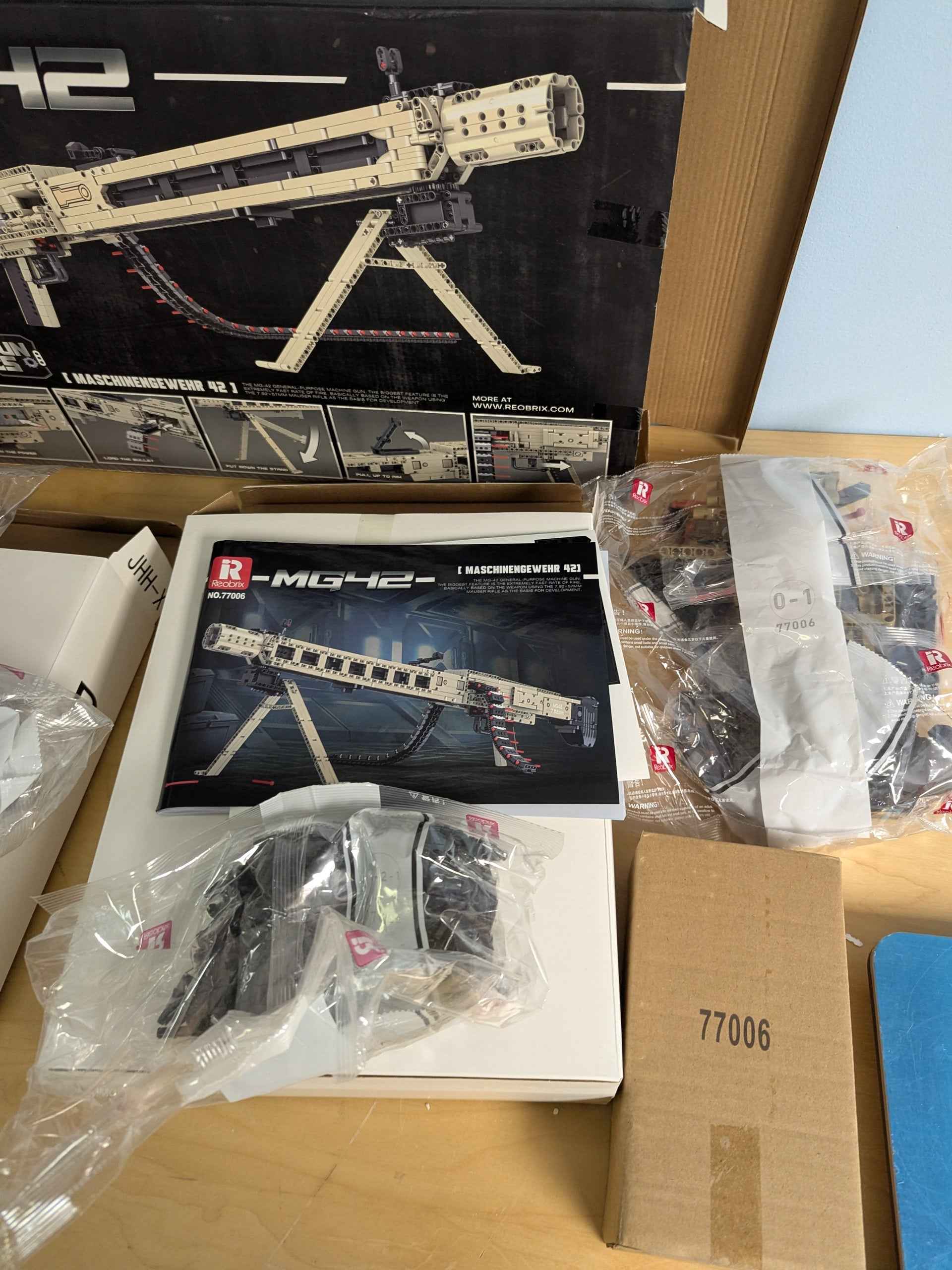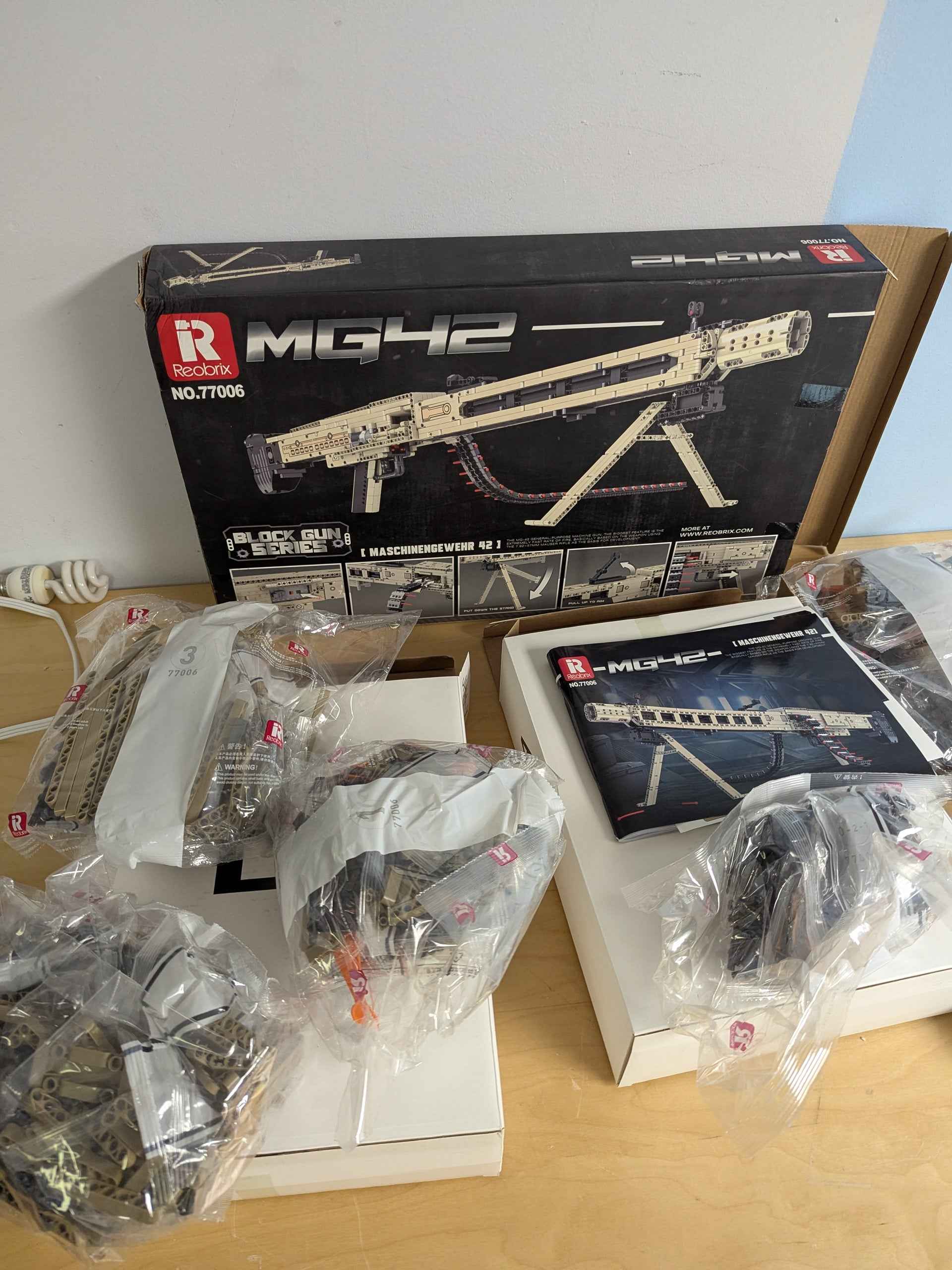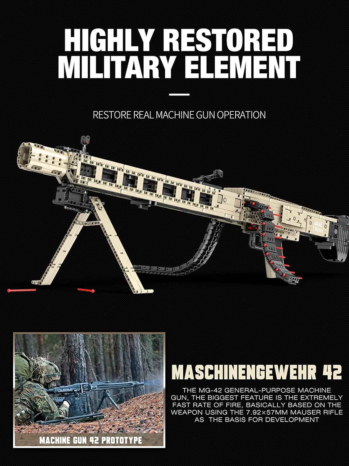 Reobrix 77006 Technic MG42 Building Blocks Set is a meticulously crafted 1886-piece model kit designed for military enthusiasts and construction lovers. Made with precision-cast components that are free of burrs, the set ensures a comfortable and precise building experience. The detailed design includes realistic features like butt stocks, magazines, triggers, and grips, bringing an authentic look to the final assembled model.