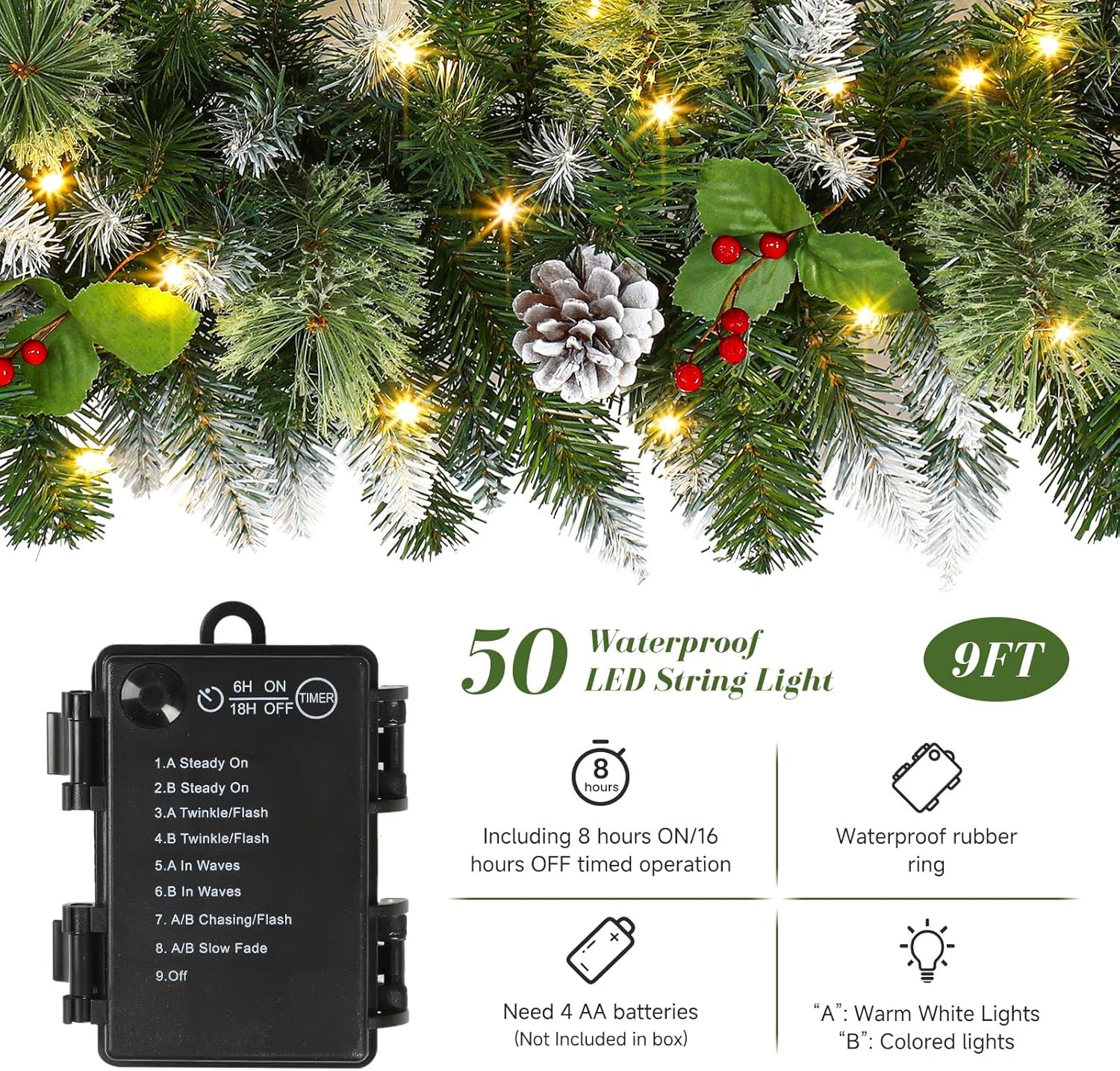 Elevate your holiday decor with the SHareconn 2Pcs 9FT Prelit Artificial Christmas Garland. This festive decoration features color-changing LED lights and an integrated timer, all powered by batteries for hassle-free indoor and outdoor use.