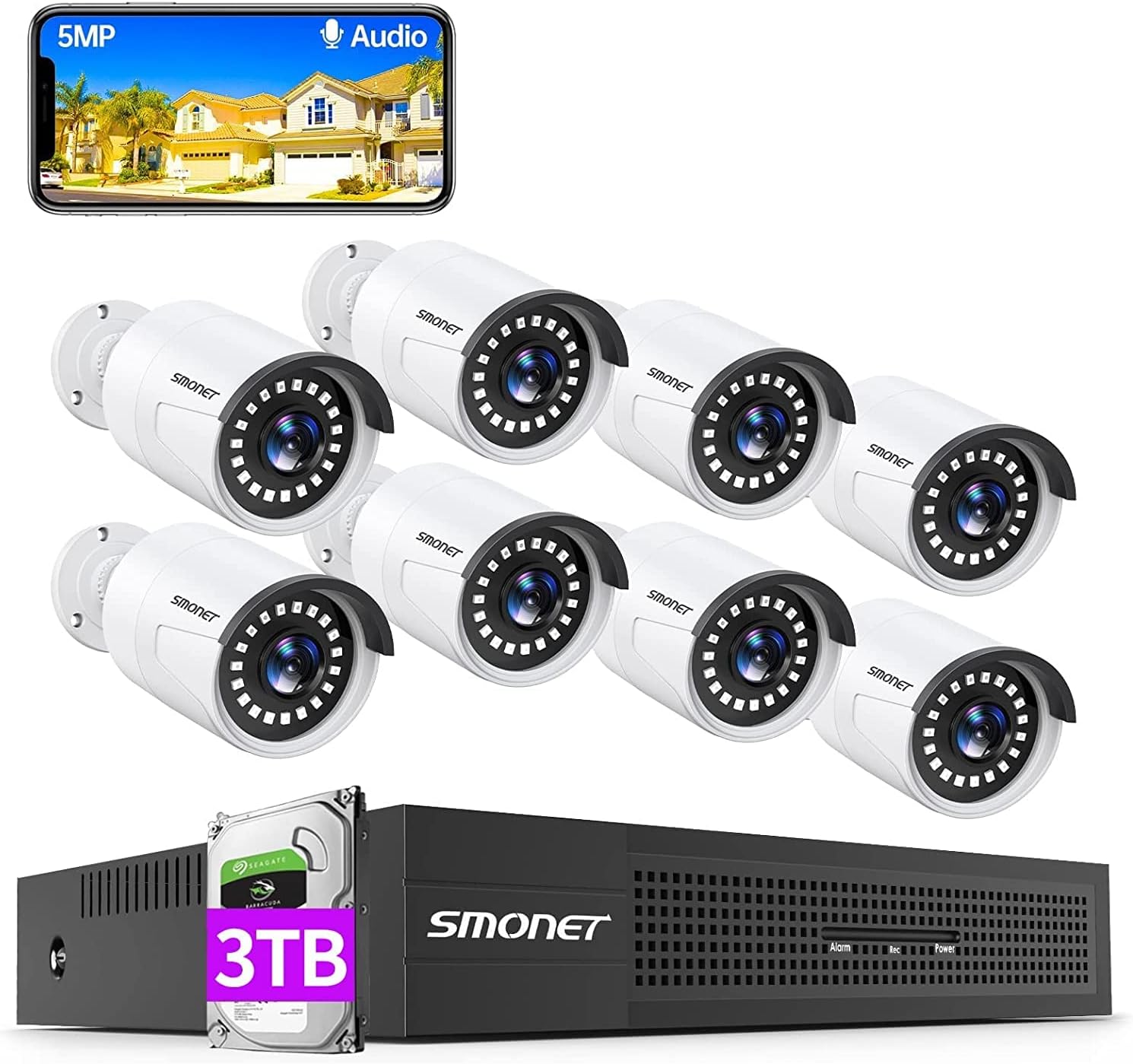 Capture every detail with the SMONET 8-Channel 5MP POE Security Camera System. This 8-camera kit delivers super HD 5MP (2560x1920) video resolution with advanced H.264+ compression for ultra-efficient storage and transmission. The system includes night vision capabilities up to 100ft, ensuring clear footage even in complete darkness. Designed for both indoor and outdoor use, the waterproof IP66-rated cameras are built to withstand harsh weather conditions.