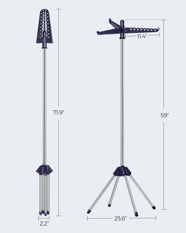 Stay organized and efficient with the SONGMICS Clothes Drying Rack, a durable and space-saving solution for drying multiple garments. Standing at 25.6"D x 25.6"W x 59"H during use, this folding laundry rack is ideal for small spaces. Its 3 rotatable arms allow easy access to clothes from all sides, while the stainless steel construction ensures rust resistance and sturdiness. With 4 legs for added stability, it can hold up to 27 pieces of clothing, thanks to reinforced holes designed to secure hangers in place.