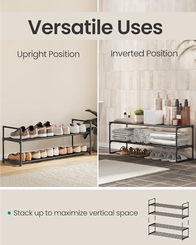 Organize your footwear with the SONGMICS 2-Tier Shoe Rack. Designed for practicality and space efficiency, this durable shoe organizer features a modern black finish and robust metal construction.