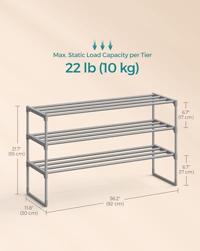 Organize your entryway with the SONGMICS 3-Tier Shoe Rack. This sturdy, stackable storage solution offers flexible use—stand upright, flip upside down for under-shelf space, or stack tiers to maximize vertical room.
