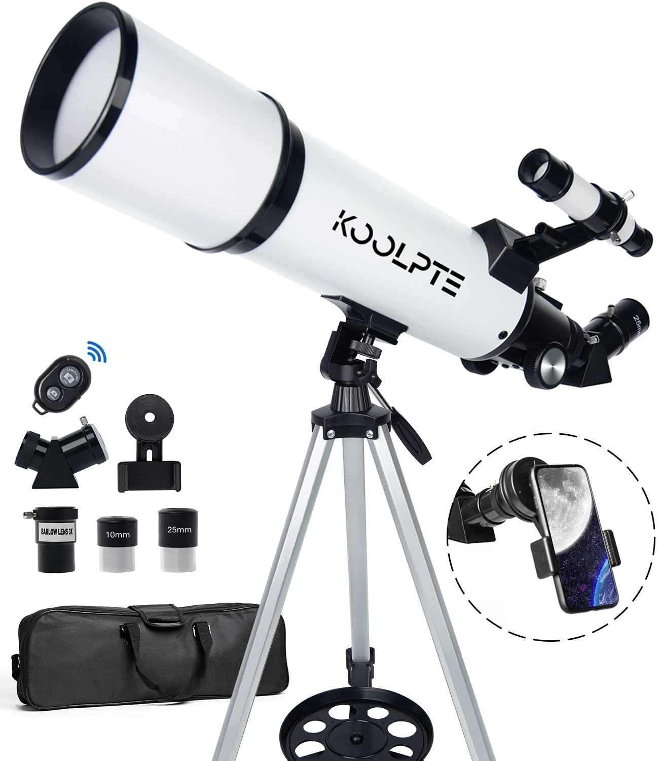 Designed for portability, the telescope includes a phone adapter for live streaming, an adjustable aluminum tripod, and a durable carrying bag. Wireless remote control adds convenience, making it easy to capture stunning images on the go. No tools are required for setup—ideal for beginners and experienced users alike.