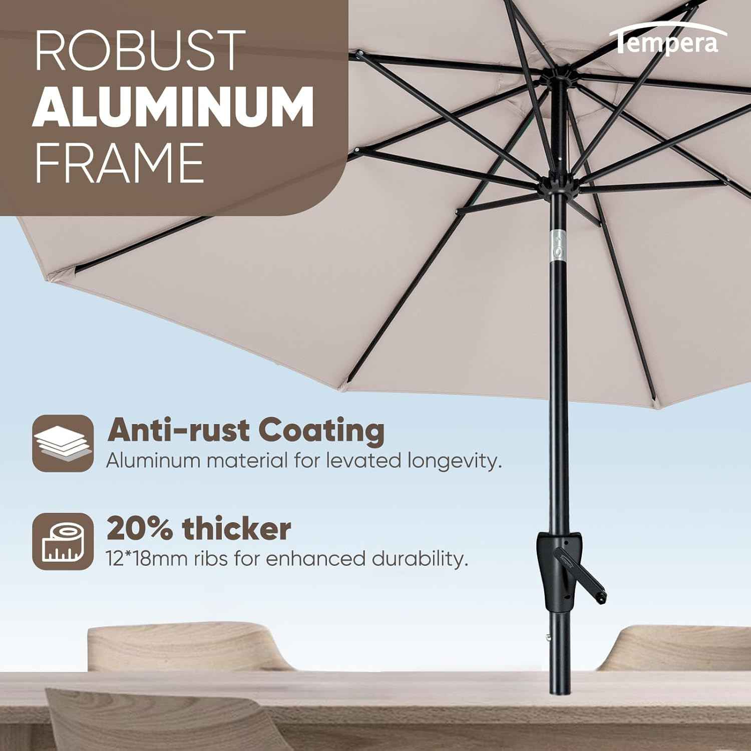 Stay cool and stylish outdoors with the Tempera 9 ft Patio Market Outdoor Table Umbrella. This durable umbrella offers a fade-resistant polyester canopy, a sturdy frame, and convenient tilt-and-crank functionality for easy shade adjustment.
