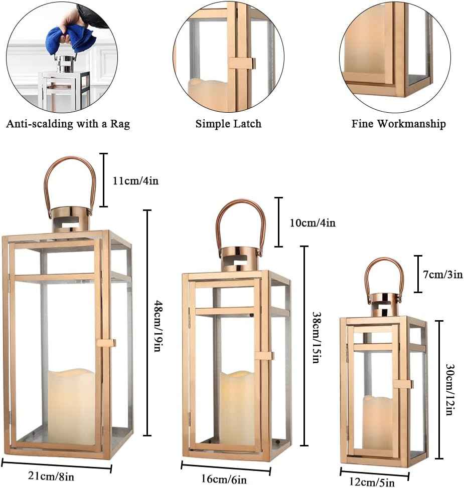Elevate your space with the TRIROCKS Set of 2 Candle Lanterns in Rose Gold—featuring one large and one small lantern for a beautifully layered look. Made of polished stainless steel with clear glass panels, these lanterns are perfect for indoor or outdoor use. Ideal for Christmas, weddings, or cozy home ambiance, they can be displayed on tables or hung using the included rings. Simply add your favorite scented, LED, or tealight candles (not included).