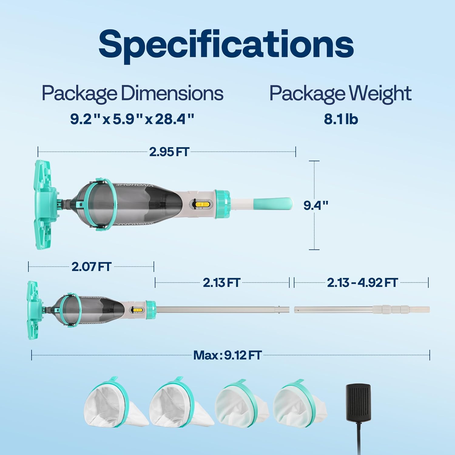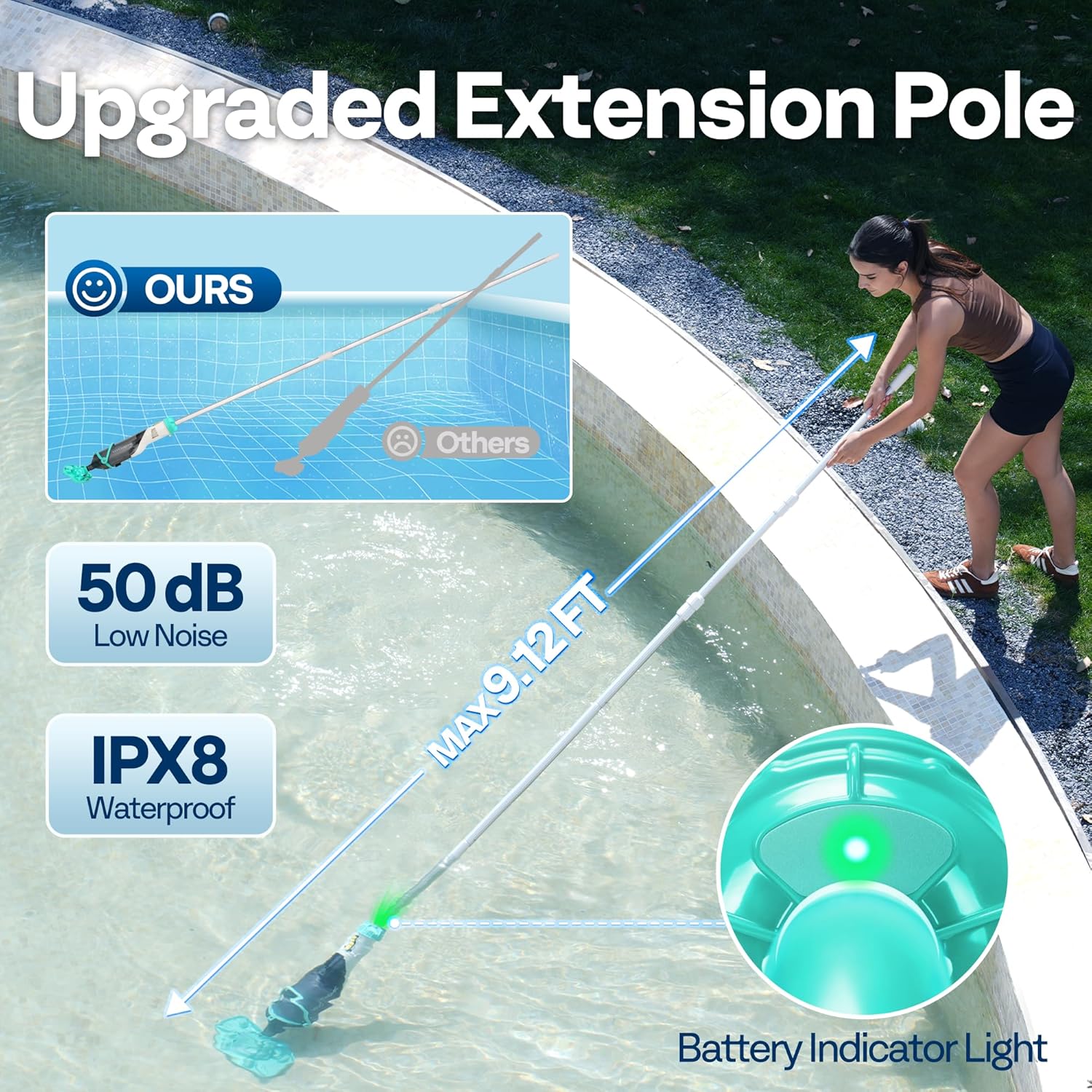 ✅ Extra Long Reach: Includes a 7.05 ft extra-long pole for cleaning far corners and the bottom of your pool, while the short handle is perfect for close-range tasks